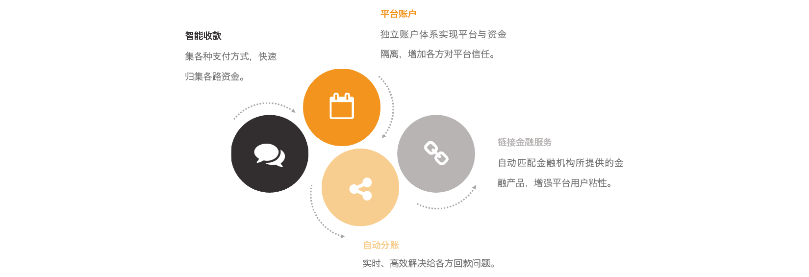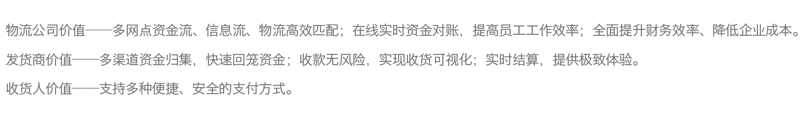 协助物流行业安全、快速地构建资金管理体系,为自建物流、第三方物流及无车承运人等机构提供专业化、系统化的信息流、商流、物流和资金流整合服务,