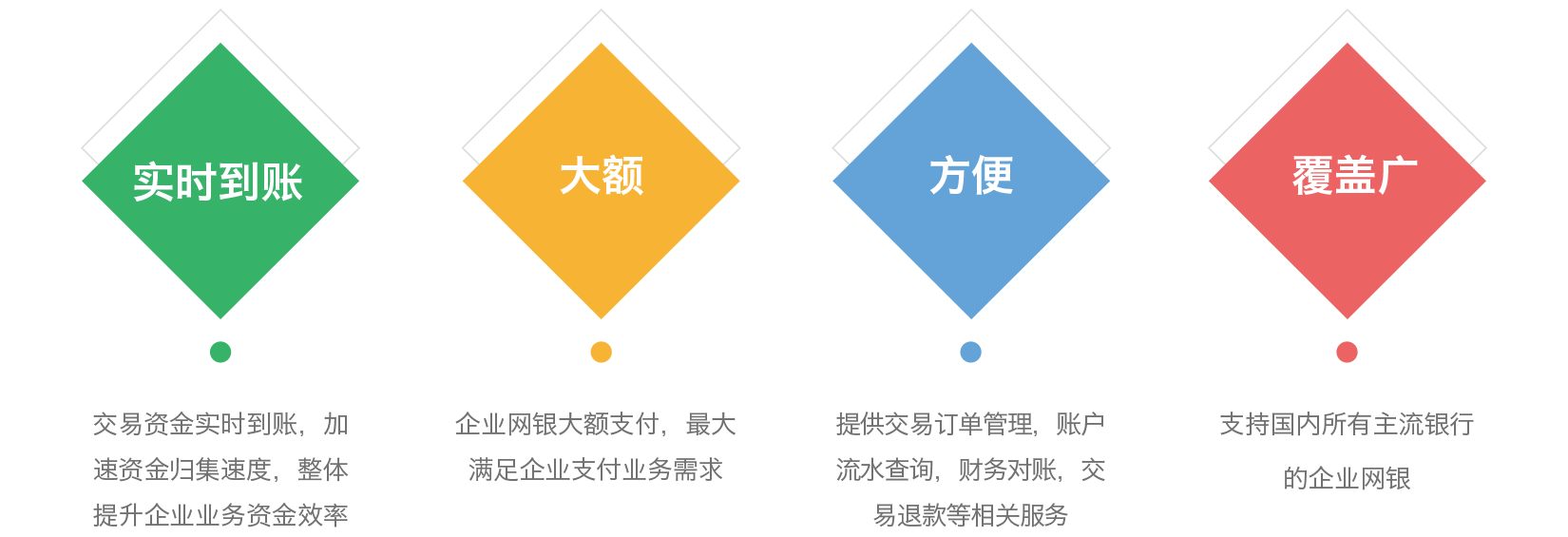 B2B用于企业之间(B2B)交易所涉及的大额资金收款、企业资金归集的支付产品,支持国内主流银行企业账户大额支付,是融宝专为您的大额交易收付款及资金运转提供了方便、快捷、安全的大额资金收款服务。
